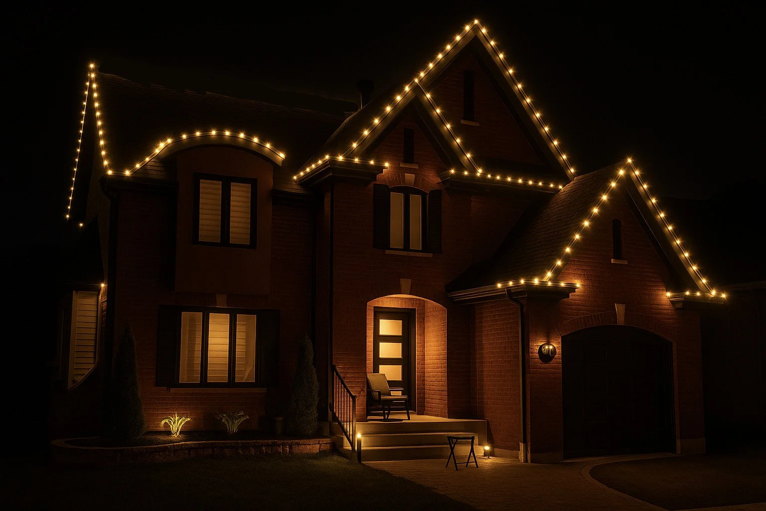 Chaque maison est unique — nos designs le sont aussi. Nous créons un tracé lumineux parfaitement adapté à votre toiture, vos arbres ou votre façade, avec des lumières C9 blanches chaudes, alignées au centimètre près pour un résultat uniforme, élégant et spectaculaire.